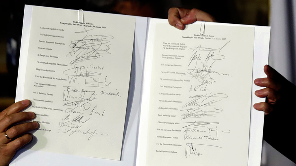 Римскую декларацию по будущему сообщества без Великобритании подписали главы государств и правительств 27 стран Евросоюза. В ней они дали оценку достижениям союза за минувшие 60 лет и заявили, что берут на себя обязательство работать на благо безопасной, защищенной, процветающей, надежной и более сильной на мировой арене Европы.