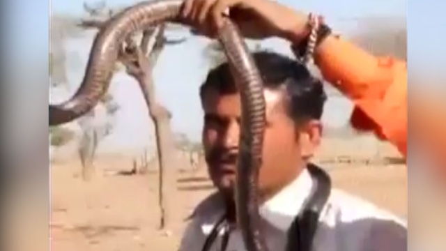 В индийском городе Джодхпур турист решил сфотографироваться с ядовитой змеей, которую держал в руках ее хозяин. Но во время съемок кобра укусила мужчину в щеку. Это произошло настолько быстро, что несчастный даже не сразу понял, что случилось и стал с недоумением трогать себя за щеку. Все это было запечатлено на видео.