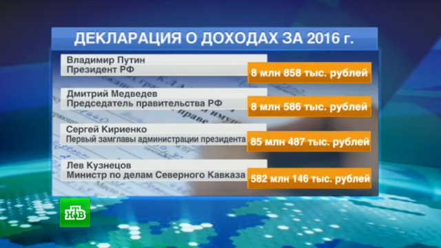 Согласно декларации, глава государства за 2016 год заработал 8 млн 858 тыс. рублей.