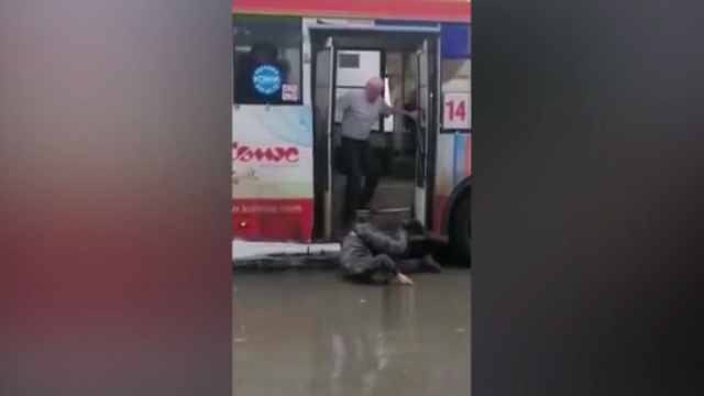 После этого в кадре появляется мужчина, который оттаскивает лежащего вниз головой в луже человека. Не из опасений, что тот пострадал, травмирован и может захлебнуться, а потому что его ноги мешают дверям автобуса закрыться.