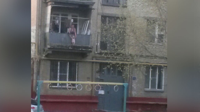 На фото, сделанное очевидцами, видно, что женщина свесила младенца с балкона второго этажа. Она держит ребенка за обе руки, а он лишь слегка касается ногами бетонного выступа внешней части балкона.