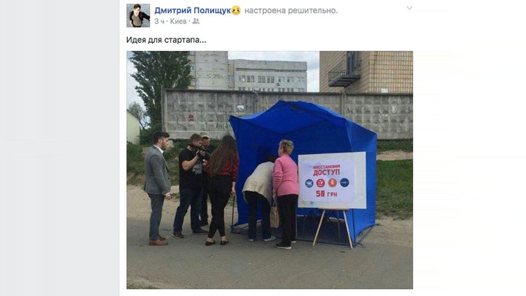 Информация о предприимчивых киевлянах, установивших палатки с услугами по разблокировке российских соцсетей, появилась на странице сообщества «Типичный Киев» в Facebook.