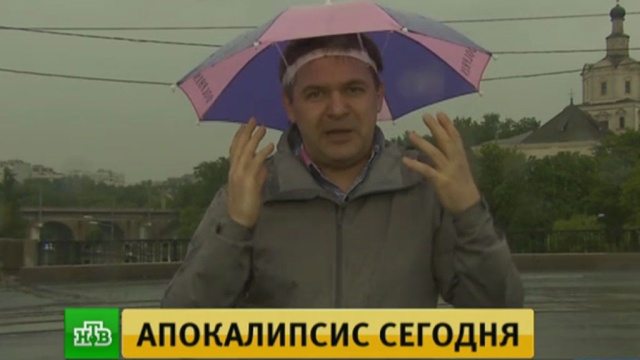 Ведущий НТВ Андрей Скворцов покинул студию в «Останкино», чтобы рассказать о прогнозе погоды из эпицентра катаклизма. Он предстал перед телезрителями в образе героя Джима Керри из фильма «Брюс Всемогущий».