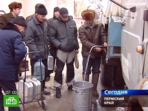 Сегодня утром 50 тысяч жителей города Краснокамска в Пермском крае снова встали в очередь за самым дефицитным и ходовым товаром — водой. Краны остаются сухими уже вторые сутки.