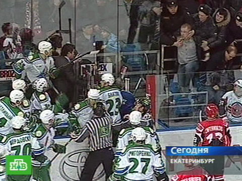 В Екатеринбурге хоккейный матч превратился в настоящие бои без правил, причем не на катке, а на трибунах. Во время игры один из местных болельщиков перелез через ограждение и нанес несколько ударов по голове вратарю команды гостей Виталию Колеснику, который находился в этот момент на скамейке запасных.
