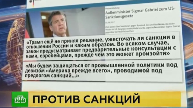 Зигмар Габриэль, министр иностранных дел ФРГ: «Трамп пока не принял решение, как и будет ли ужесточен санкционный режим против России. Законопроект в любом случае предусматривает консультации с нами, европейцами, прежде чем это сможет произойти… Мы будем защищаться от промышленной политики под девизом „Америка превыше всего“, проводимой под предлогом санкций».