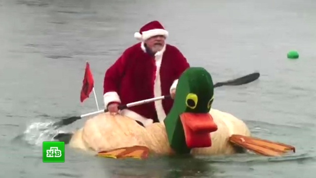 Посмотреть на заплыв собрались тысячи горожан. Сами участники нарядились в яркие костюмы от супергероев до зубных фей. В тыкве с веслом появился даже