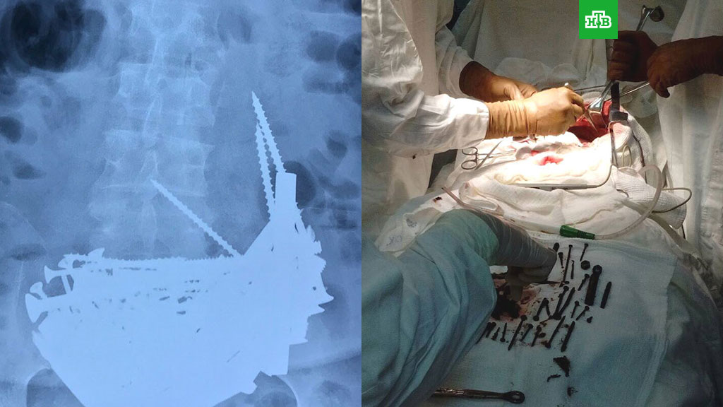 Из сообщения больницы: «Из желудка были извлечены 152 железных предмета: длинные гвозди, крупные шурупы, болты, гайки, дверные шпингалеты, отрезки арматуры длиной до 15 см и даже серебряная цепочка