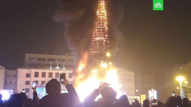 25-метровая искусственная елка вспыхнула во время новогодних гуляний в Южно-Сахалинске .