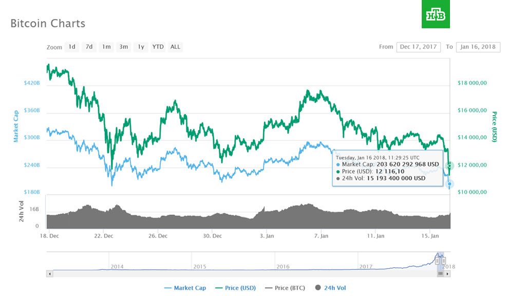 По данным портала Coinmarketcap, 16 января в 14:46 по Москве один биткоин стоил 12 тысяч 116 долларов. Таким образом, за сутки биткоин подешевел на 12,95%.