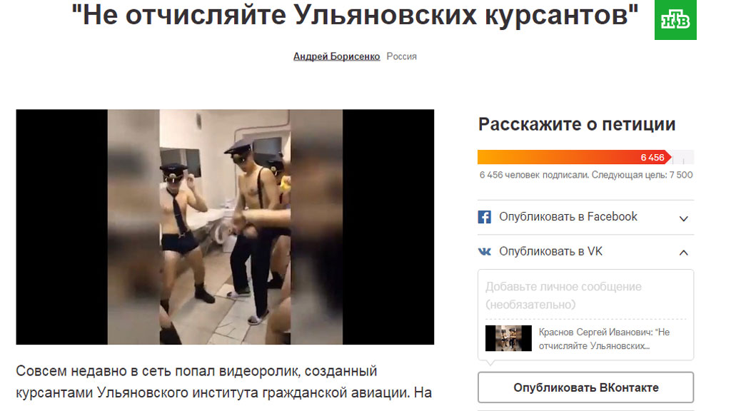 В петиции, размещенной на портале change.org, говорится, что курсантов уже отстранили от занятий, хотя ни у кого из них не было проблем с учебой и дисциплиной. Так же там сообщается, что администрация вуза готовит документы на отчисление 14 человек. Авторы петиции называют выходку курсантов «безобидной пародией» и просят не отчислять, снявшихся в видео молодых людей.