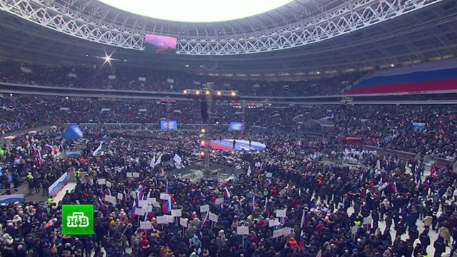 На митинг пришли около 130 тысяч человек. Людей было больше, чем зрительских мест, которые стадион получил после реконструкции, завершившейся в прошлом году. Аншлаг на трибунах, места не было и на поле, где разместили главную трибуну митинга. Владимир Путин появился в «Лужниках» вслед за олимпийской сборной России — хоккеистами, которые впервые с 1992 года завоевали для нашей страны золотые олимпийские медали.