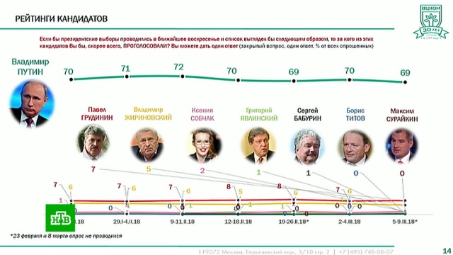 По данным опросов, за неделю до президентских выборов, отдать свой голос за Владимира Путина готовы 69% избирателей, за Павла Грудинина — 7%, за Владимира Жириновского — 5%, за Ксению Собчак — 2%, за Григория Явлинского — 1%, за Сергея Бабурина — 1%, за Бориса Титова — менее 1%, за Максима Сурайкина — менее 1%. Антирейтинг кандидатов возглавляет Ксения Собчак: 82% опрошенных заявляют, что не проголосуют за нее ни при каких обстоятельствах.