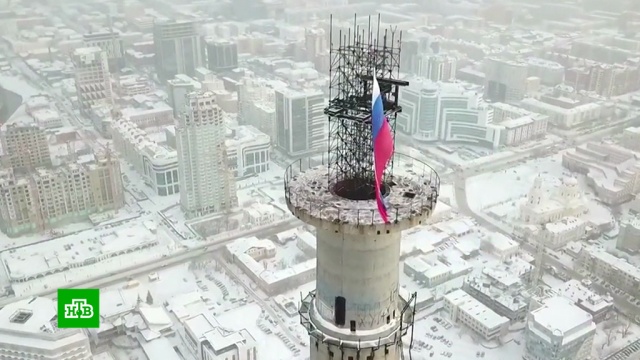 В Екатеринбурге на недостроенную телебашню залезли противники ее сноса и парашютисты. Активисты развернули на крыше российский флаг и требуют провести референдум о дальнейшей судьбе здания.