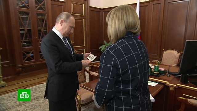 Состоялась встреча Владимира Путина с председателем Центризбиркома Эллой Памфиловой. На встрече глава ЦИК вручила Путину удостоверение избранного президента России.