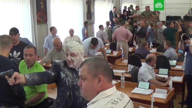 Инцидент произошел практически в самом начале заседания, когда принимали повестку дня. К трибуне подошли представители «Правого сектора» и начали потасовку, во время которой националисты взобрались на трибуну и заблокировали городского главу Андрея Фисака. По словам очевидцев, протестующие надели депутату Александру Рыбакову на голову пакет с кефиром, а мэра облили зеленкой.
