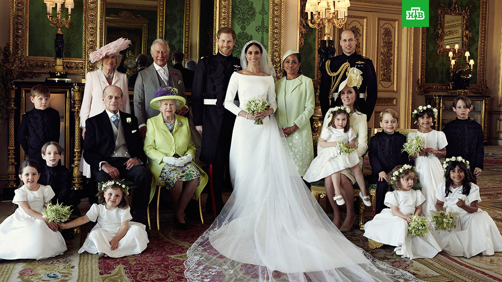 На первой фотографии молодожены запечатлены в окружении ближайших родственников — королевы Елизаветы II и ее супруга герцога Эдинбургского, отца жениха принца Чарльза и его супруги Камиллы, брата жениха принца Уильяма с супругой Кейт с трехлетней принцессой Шарлоттой на коленях. На фото присутствуют все подружки невесты и все пажи, в том числе брат Шарлотты, четырехлетний принц Джордж.