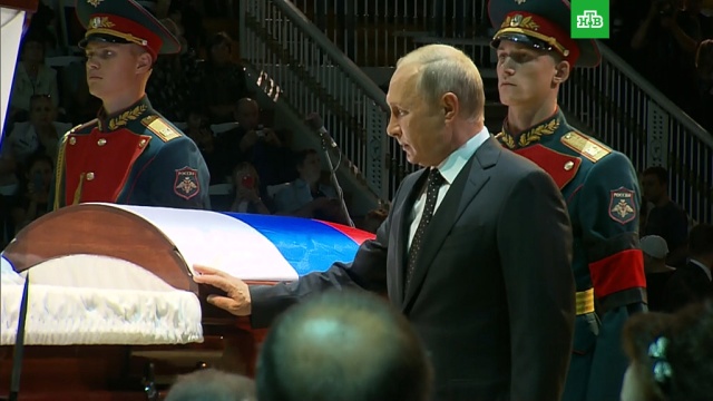 Путин почтил память Кобзона минутой молчания. Склонив голову, президент постоял у гроба и возложил букет у его подножия. Затем глава государства подошел к вдове, детям и внуками Кобзона. Сев рядом с Нинель Кобзон, российский лидер некоторое время с ней беседовал.