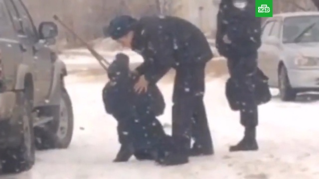 На кадрах, опубликованных Следственным комитетом, видно, как один из стражей порядка, находясь в авто, грубо толкнул мужчину, в результате чего тот упал. Последний ударил костылем отъезжающий автомобиль. Затем другой полицейский вышел из машины и пнул лежащего. Короткий ролик заканчивается тем, что люди в форме тащат волоком пострадавшего по снегу.