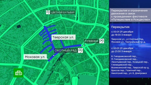 В центре Москвы начался фестиваль «Путешествие в Рождество». В связи с этим в столице изменена схема движения автомобилей. Начиная с 28 декабря и вплоть до 3 января будут перекрыты некоторые центральные улицы.