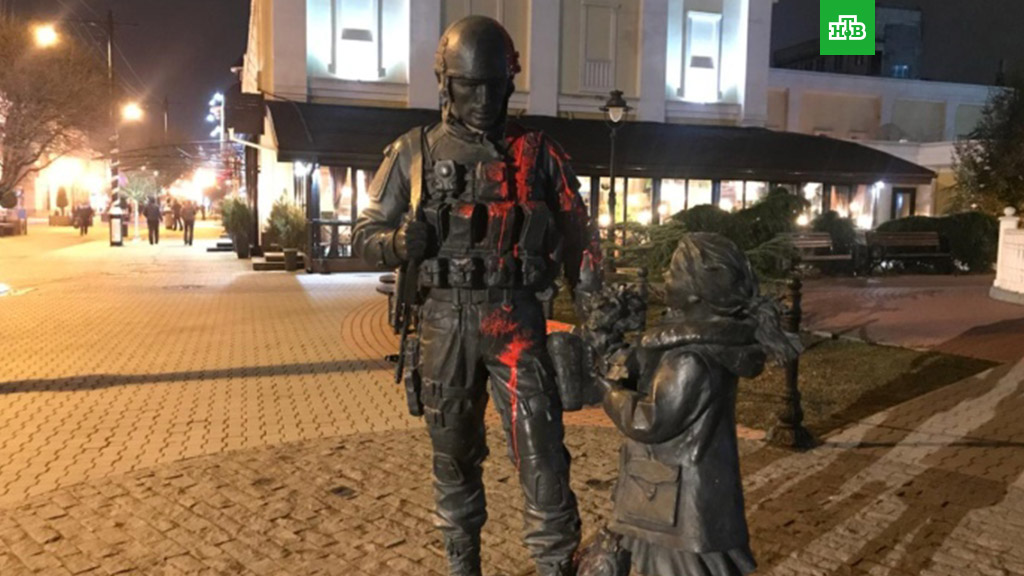 В Симферополе пьяный мужчина облил красной краской памятник Вежливым людям. Вандала задержали полицейские.