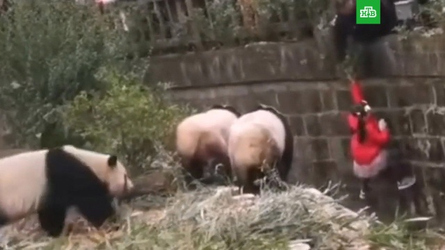 Многие также сняли на видео, как после этого перевозбужденные криками и появлением людей в вольере большие панды раздают друг дружке увесистые оплеухи.