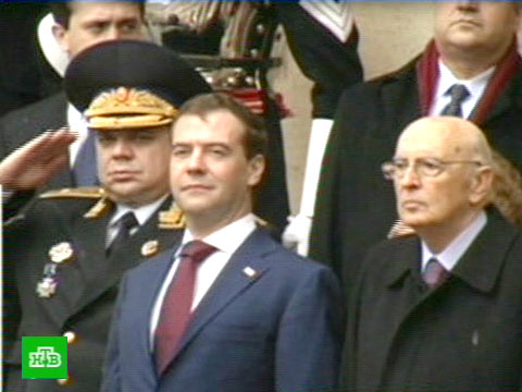 Проливной дождь, весь день идущий в Риме, конечно, не внес корректив в торжественную церемонию, однако многие, кто принимает в ней участие, включая президентских гвардейцев и музыкантов, промокли до нитки. И лишь в те пять минут, когда проходила торжественная встреча Дмитрия Медведева с президентом Италии Джорджо Наполитано, дождь удивительным образом прекратился.