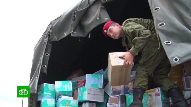 Сотрудники полиции Центрального военного округа привезли предметы первой необходимости и продукты. Они же и разгружали машины.
