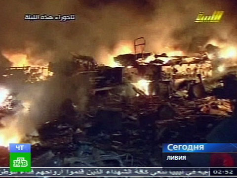 Огонь полыхал сегодняшней ночью в предместье Триполи — Тажуре. Ливийское телевидение дополняет кадры сообщениями об авиаударах по кварталам с мирным населением и многочисленных жертвах среди него.