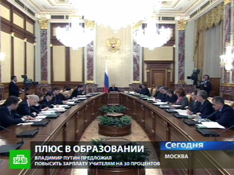 Владимир Путин, председатель Правительства РФ: «В чем заключается предложение. Мы могли бы помочь регионам в части приведения в порядок этих учреждений, а те средства, которые у них будут высвобождаться за счет наших денег, они должны направить на повышение заработных плат учителям. Конечной целью мероприятий подобного рода является доведение средней зарплаты учителя до средней зарплаты по экономике в соответствующем регионе страны. И если мы по этому пути пойдем, а я предлагаю поступить именно таким образом, то уже в ближайшее время мы сможем добиться повышения заработных плат учителей процентов на 30».