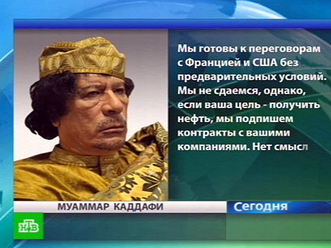 Муаммар Каддафи, лидер ливийской революции: «Мы готовы к переговорам с Францией и США без предварительных условий. Мы не сдаемся, однако, если ваша цель — получить нефть, мы подпишем контракты с вашими компаниями. Нет смысла