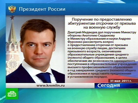 Пресс-служба Кремля сообщила о том, что Дмитрий Медведев поручил министрам образования и обороны рассмотреть вопрос об отсрочках от армии для выпускников школ.