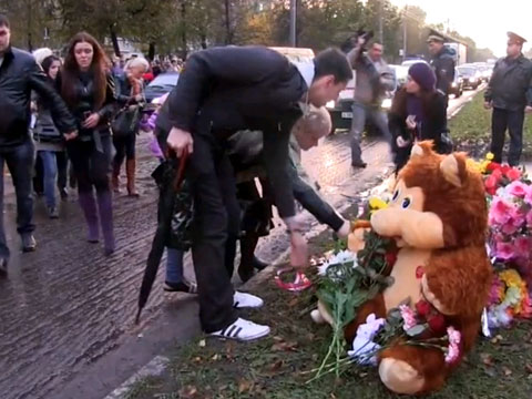 Под знак пешеходного перехода, прямо на разделительную полосу местные жители — женщины и мужчины, часто со своими маленькими детьми — складывали цветы, мягкие игрушки и ставили свечи. Там погибла трехлетняя девочка Соня. Они с матерью шли в гости на день рождения, переходили дорогу по правилам, держась за руки.