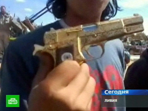 Тем временем революционеры ликуют. Журналисты рассмотрели в руках одного из них золотой пистолет. Совсем недавно он принадлежал Каддафи, но человека, который держал под своим каблуком Ливию долгие 42 года, больше нет. Следовательно, эти выстрелы в воздух вместо салюта победы.