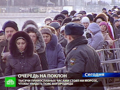 Тысячи православных верующих собрались сегодня у Храма Христа Спасителя в Москве, преодолевая физические испытания, на которые пошли ради святыни. Пояс Пресвятой Богородицы, обладающий, по преданию, исцеляющей силой, привезли в столицу два дня назад. И все это время люди часами, а иногда и сутками стоят на морозе, изредка забегая погреться в автобусы, расставленные вдоль очереди.