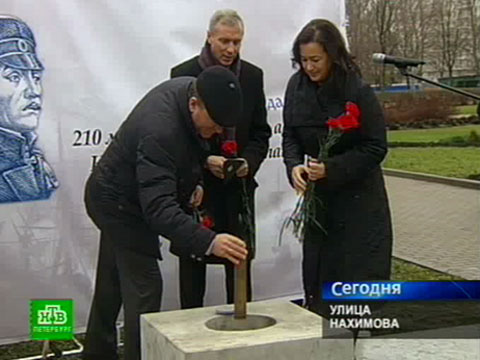 Сегодня на петербургской улице Нахимова установили закладной камень в сквере, где должен появиться памятник знаменитому флотоводцу. В основание монумента заложили гильзу с землей, привезенной с малой родины Нахимова — села Гордок Смоленской области.