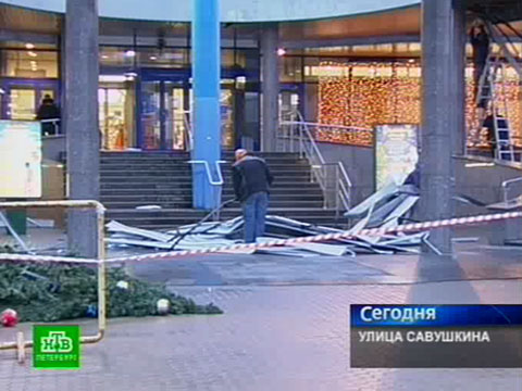 В петербургском торговом центре «Меркурий» несколько часов назад главный вход завалило металлическими листами. Как передает НТВ, сейчас подвесной потолок, который крепился к конструкции над центральными ступенями, разбирают.