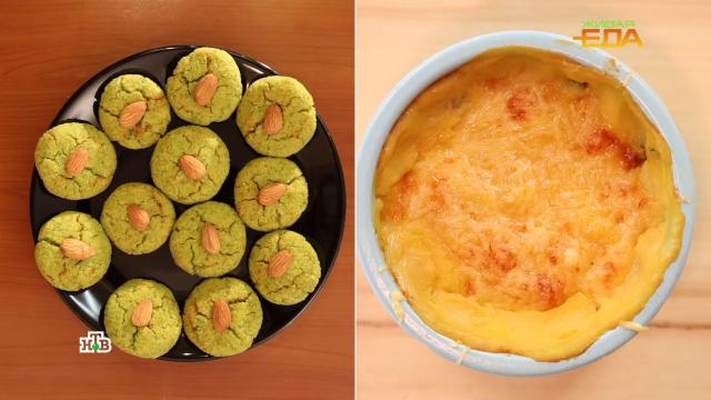 Для печенья Анастасия измельчает замороженный зеленый горошек с сиропом топинамбура, затем добавляет мягкий соевый творог — тофу, сахарозаменители стевию и эритрит и еще раз взбивает до однородности, для аромата кладет немного ванильной эссенции, а добавляет миндальную муку. Тесто получается мягким, его нужно посолить и добавить немного разрыхлителя. Осталось сформировать, украсить миндалем и запечь в духовке.