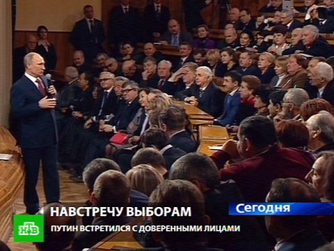 Сегодня в Москве Владимир Путин в качестве кандидата в президенты встретился со своими доверенными лицами. Среди почти 500 человек, которые будут агитировать за Путина, — как известные люди, так и те, кого принято называют рядовыми тружениками. Сегодня кандидат заявил, что в случае победы на выборах он введет налог на роскошь, радикально до нескольких десятков сократит количество мигалок и вернется к теме летнего и зимнего времени.