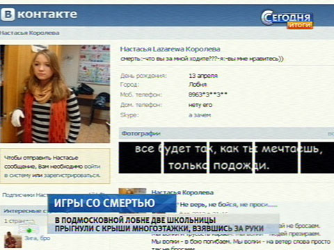 Александр Калинин, корреспондент НТВ: «На помощь полиции и родителям сейчас приходит все тот же Интернет. Ему, как видно, проще достучаться до сознания подростка. В сети появляются сайты, которые учат жить, когда жить не хочется. Некоторые прибегают к жестким мерам, показывая, как человек выглядит после смерти. Говорят, страшные картинки заставляют передумать».
