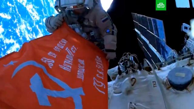 Космонавты Олег Артемьев и Денис Матвеев развернули в открытом космосе копию Знамени Победы в Великой Отечественной войне.