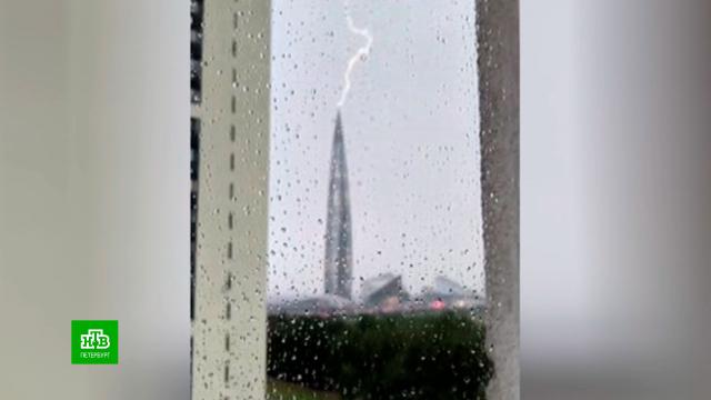 Меньше чем за час буйства стихии в разных частях города произошло несколько инцидентов: рухнул строительный кран в Невском районе, поднятые в воздух ветром мусорные баки повредили автомобили, молния попала в башню «Лахта Центра».