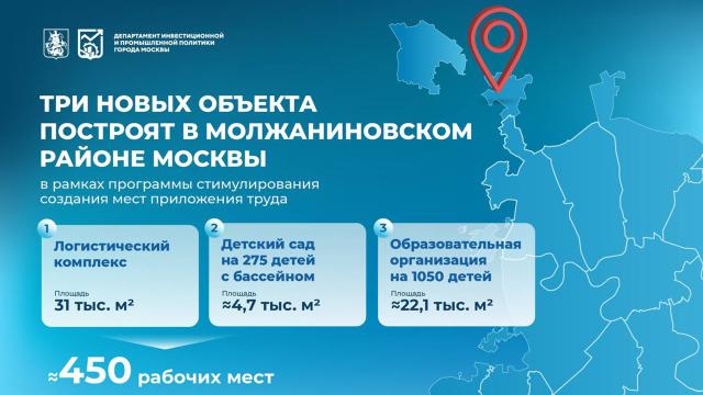В Молжаниновском районе Москвы построят три объекта по программе стимулирования создания мест приложения труда. Как рассказал мэр столицы Сергей Собянин, инвесторы возведут логистический комплекс площадью 31 тысяча квадратных метров, детский сад с бассейном на 275 детей площадью 4,7 тысячи квадратных метров и образовательную организацию на 1050 ребят площадью 22,1 тысячи «квадратов». После ввода объектов в эксплуатацию город получит 450 новых рабочих мест и комфортные условия для обучения и развития детей, отметил мэр.