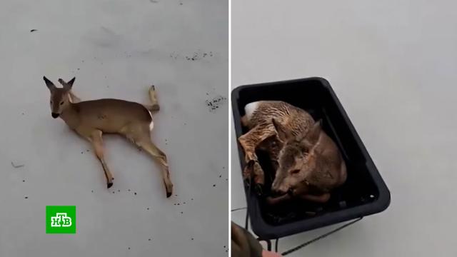 В Новосибирской области два рыбака спасли около трех сотен оленей, которые застряли на поверхности замерзшего озера.