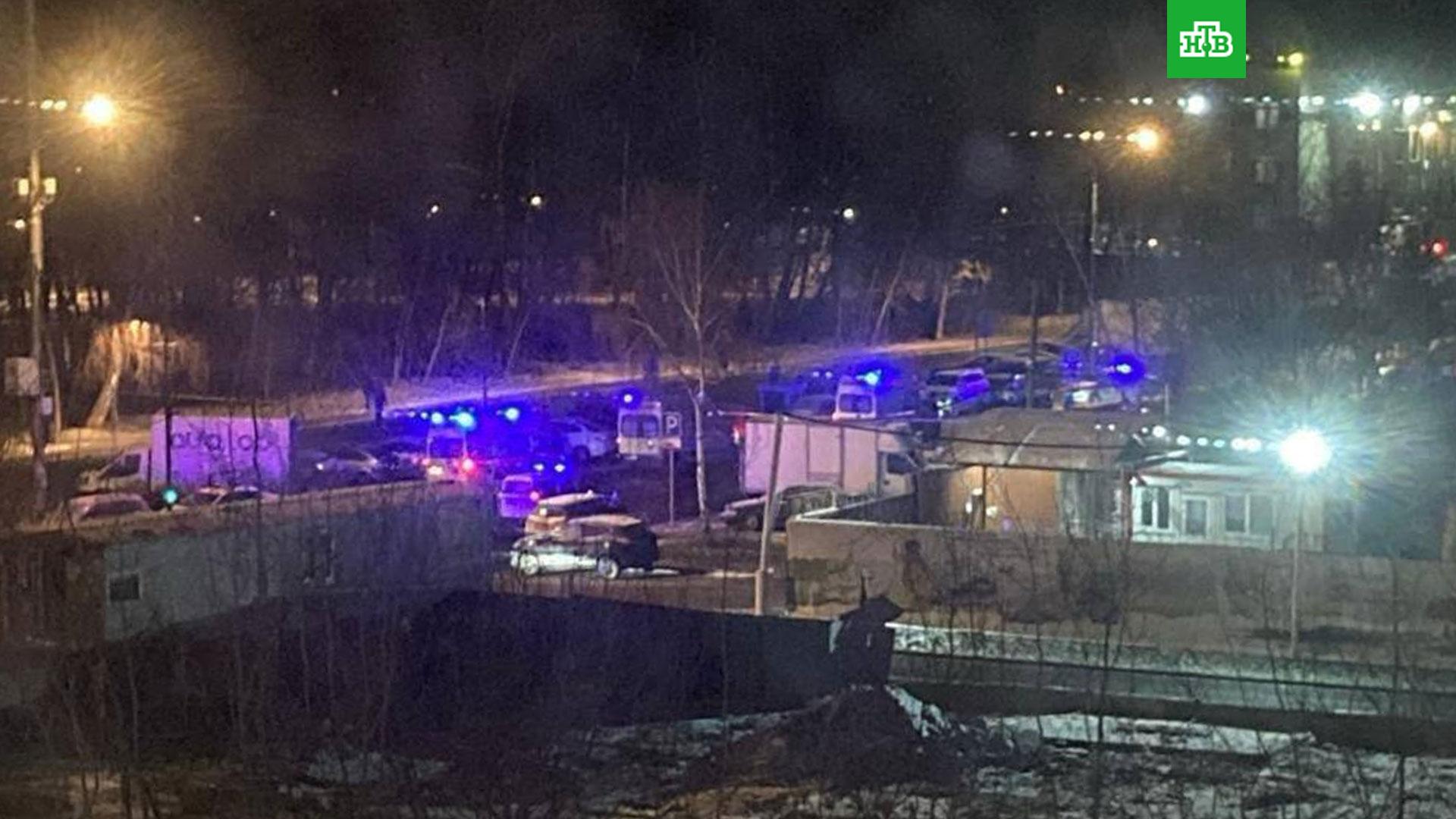 Следователи осматривают место происшествия на юге Москвы, где прогремел взрыв и пострадали сотрудники полиции.