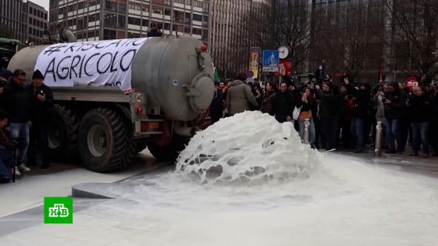 В Милане фермеры заблокировали тракторами дороги в районе центрального вокзала и здания правительства региона. Там они вылили тонны молока прямо на асфальт в знак протеста.