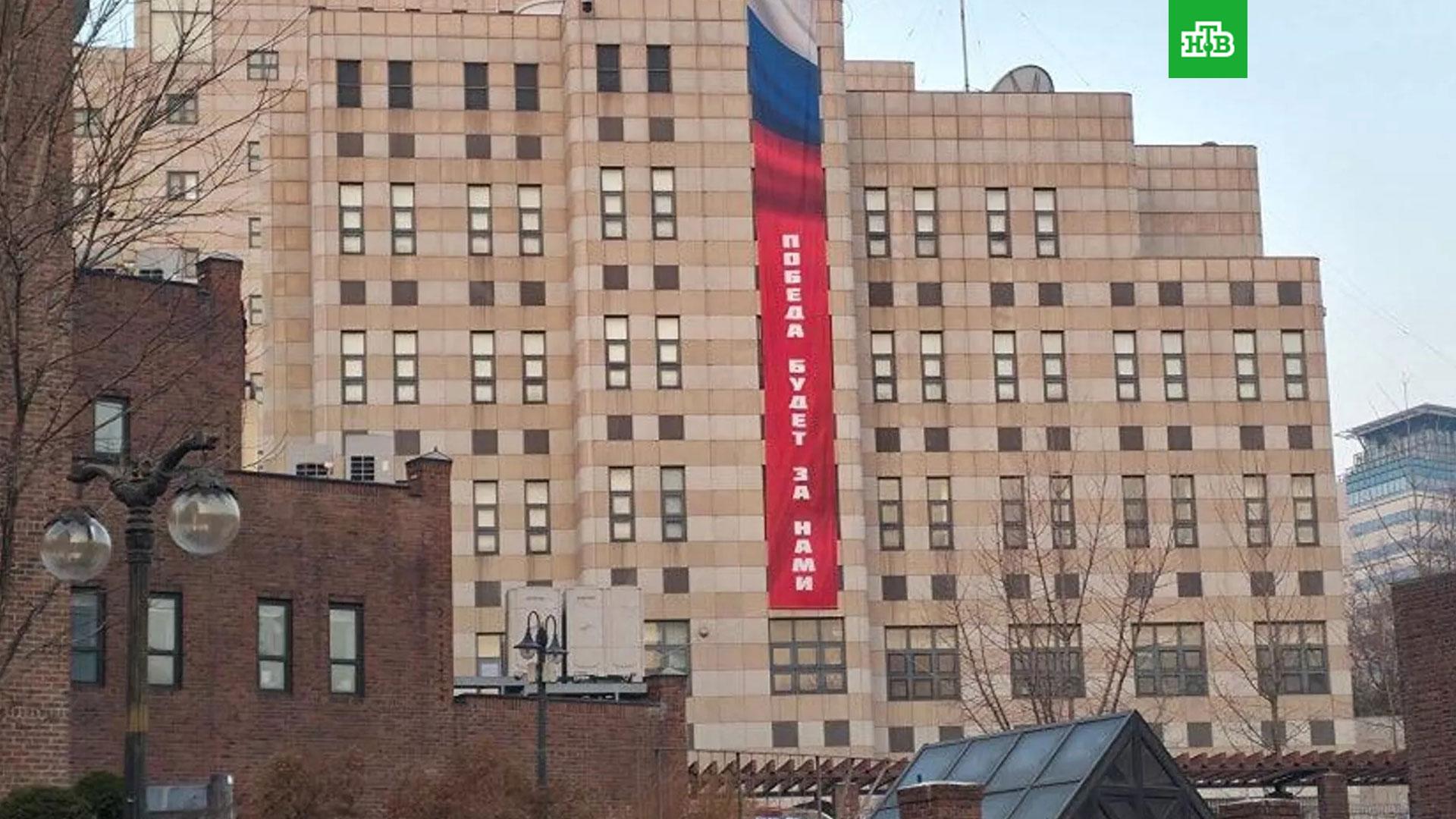 От российского посольства в Сеуле потребовали убрать баннер с надписью «Победа будет за нами».
