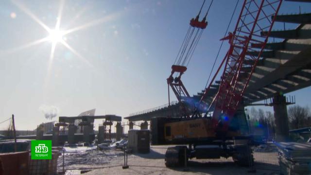На стройплощадке магистрали М32 завершают монтировать металлические пролеты на первом съезде в сторону Приморского шоссе.