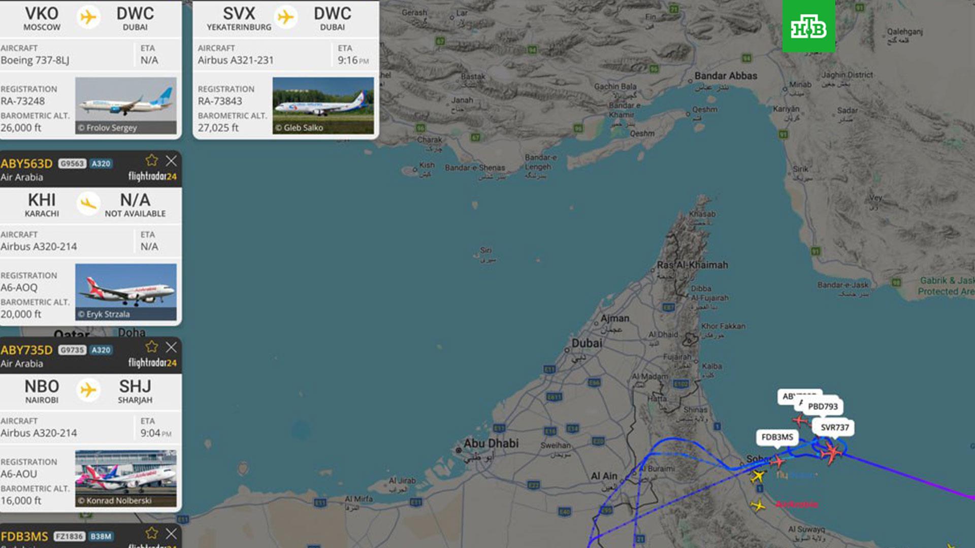 Согласно данным Flightradar24, в Дубай направлялись лайнеры из Москвы и Екатеринбурга, Лондона, Варшавы, Найроби и Карачи. Смогут ли они совершить посадку в ОАЭ и, соответственно, сумеют ли вывезти пассажиров в назначенное время, пока не ясно.