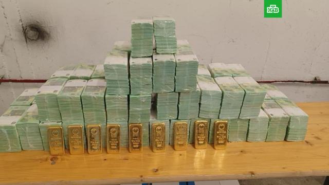 На оперативной съемке видно, как силовики останавливают две инкассаторские машины и задерживают ехавших в них мужчин. Также на кадрах видно, что деньги и золотые слитки перевозились в больших мешках.